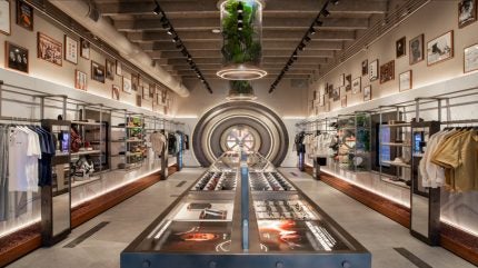 The retail space is a tribute to Oakley’s 50 years in the business. It combines a “high-tech bunker-style” environment with digital and analogue displays for immersive storytelling, athlete tributes and the Future Genesis platform.