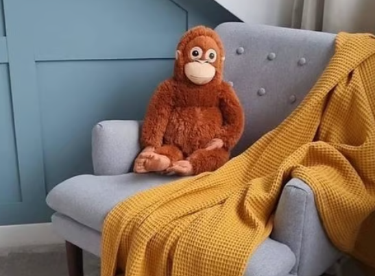 The product most frequently identified in coverage is IKEA’s DJUNGELSKOG orangutan soft toy. IKEA listings describe an orangutan plush designed to “hang” using hook-and-loop fasteners, which matches how the toy appears in the viral clips.